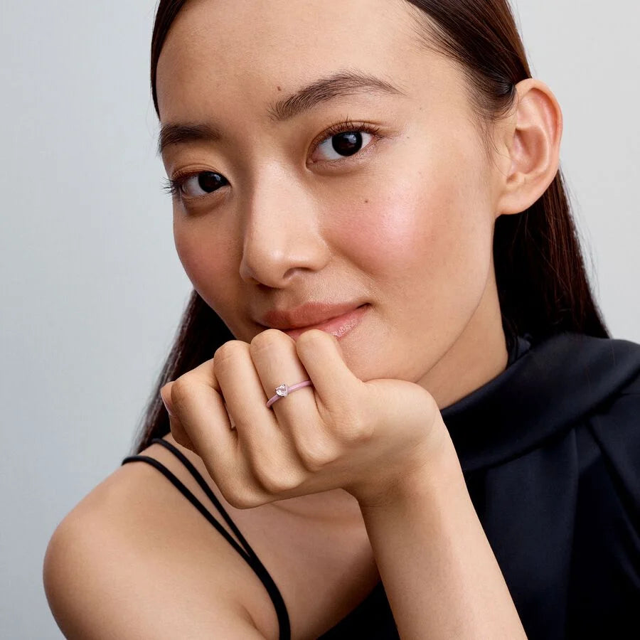 Hergestellt aus Sterlingsilber, verfügt der Ring über einen herzförmigen, in Krappen gefassten rosa Kristall, der von glitzerndem rosa Emaille umgeben ist.