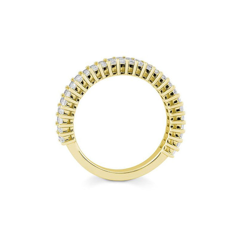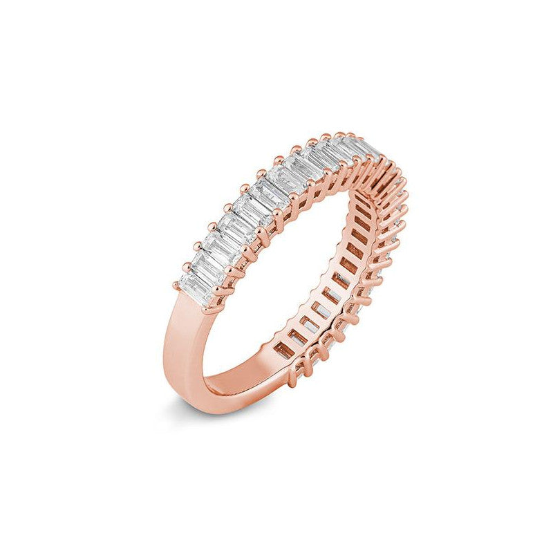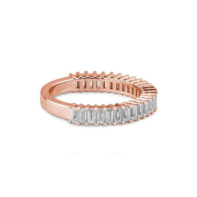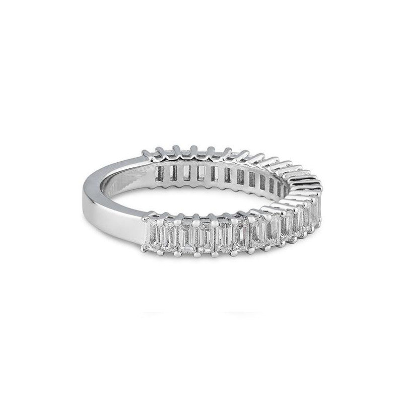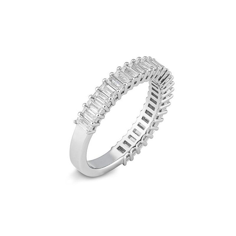 Der Ring ist mit 25 feinen Labordiamanten im Baguetteschliff besetzt, die eine Gesamtkaratzahl von 1.5 ct. bieten. Die Diamanten besitzen eine Brillantqualität von G/Vs LG und eine Reinheit von „sehr kleine Einschlüsse“ (VS), was für aussergewöhnliche Klarheit und Brillanz sorgt. Der Diamant hat die Farbe „Feines Weiss“ (Top Wesselton) und ist hervorragend geschliffen, um das Licht perfekt zu reflektieren.