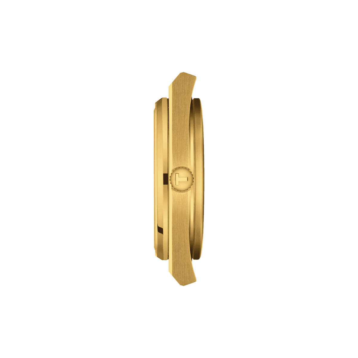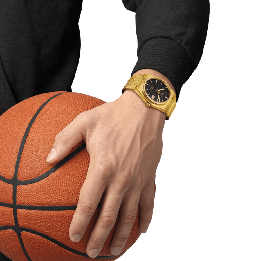 Die Tissot PRX Powermatic 80 Damian Lillard Special Edition besitzt ein 316L-Edelstahlgehäuse mit 40 Millimetern Durchmesser und gelbgoldfarbener PVD-Beschichtung. Kratzfestes, entspiegeltes Saphirglas gewährt Robustheit und beste Ablesbarkeit. Ihr Sichtboden besteht aus Mineralglas.
